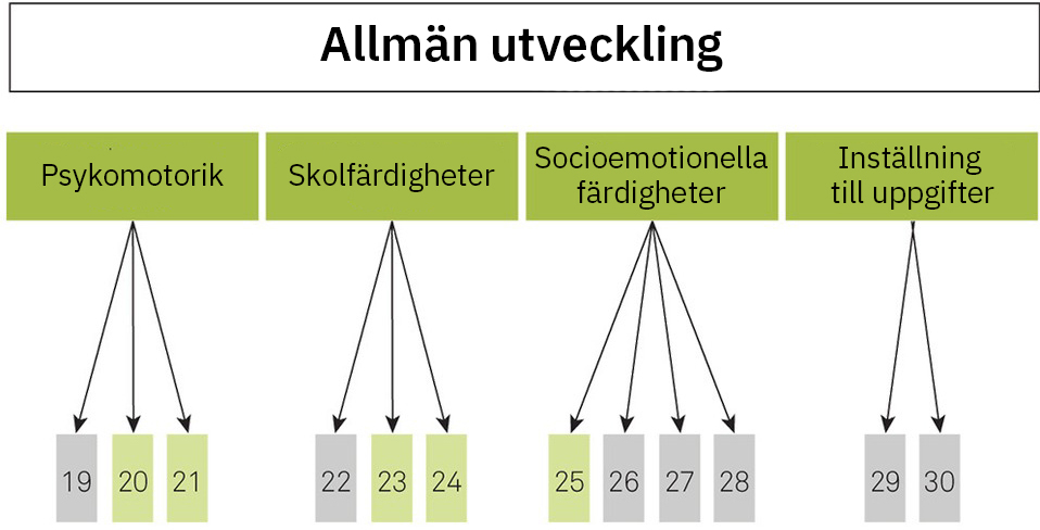 Skolfärdigheter: 4 deltest (beroende på ålder)